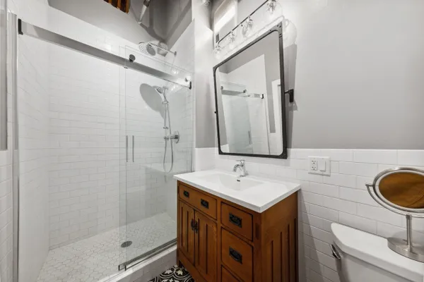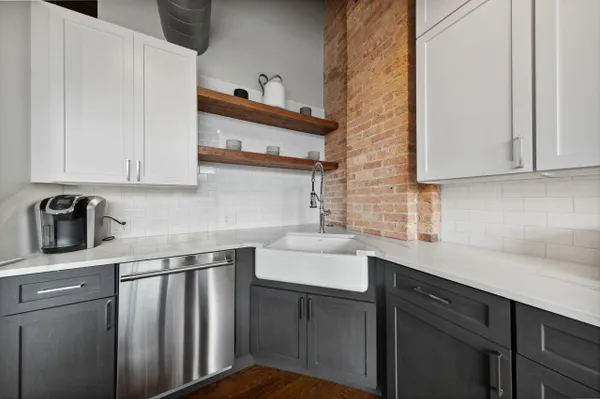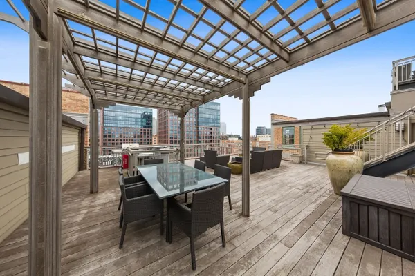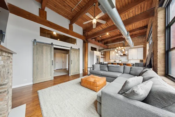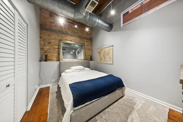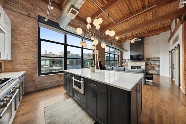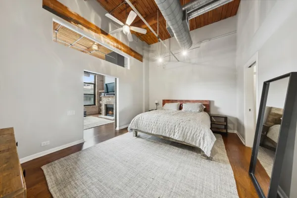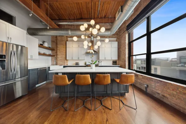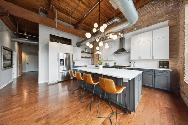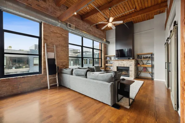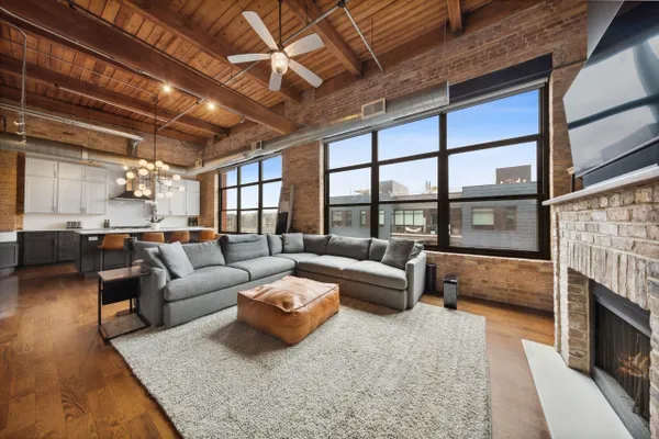 Brick and timber penthouse loft in the epicenter of the West Loop. This renovated live/work condo features 4 inch oak tongue and groove hardwood floors, kitchen anchored by large island, quartz counters (which look like Calcatta Marble) subway tile backsplash, open shelving, all wood and dovetail-joint cabinets and drawers in a walnut-grey finish, Thermador 6-burner range, Samsung refrigerator with ice maker and water dispenser, stainless hood, microwave drawer, Thermador dishwasher. Wood burning fireplace with quartz hearth. Both bedrooms are fully enclosed. Primary suite has sliding wood doors. Baths have custom cabinetry with ample storage. Huge laundry and storage room. Parking space is deeded, space number is 46.